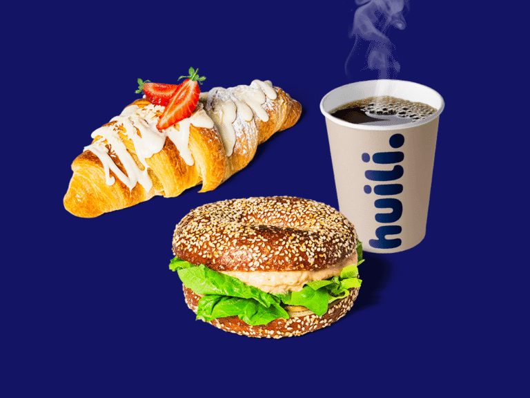 Huilista saat kahta kahvilaatua sekä maittavat vitriinituotteet niin makeaan kuin suolaiseen nälkään. Maistuisiko vaikka savulohibagel tai croissantti herkullisella pistaasipähkinätahnalla?
