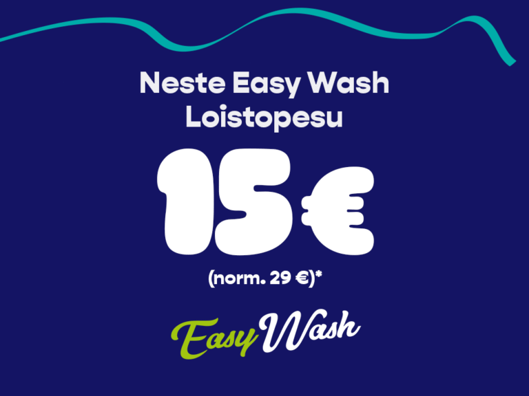 Neste Easy Wash Loistopesu vain 15 € (norm. 29 €). Voimassa 19.10. asti. Alennus voimassa tällä asemalla, kun maksat myymälän kassalle tai automaatille.